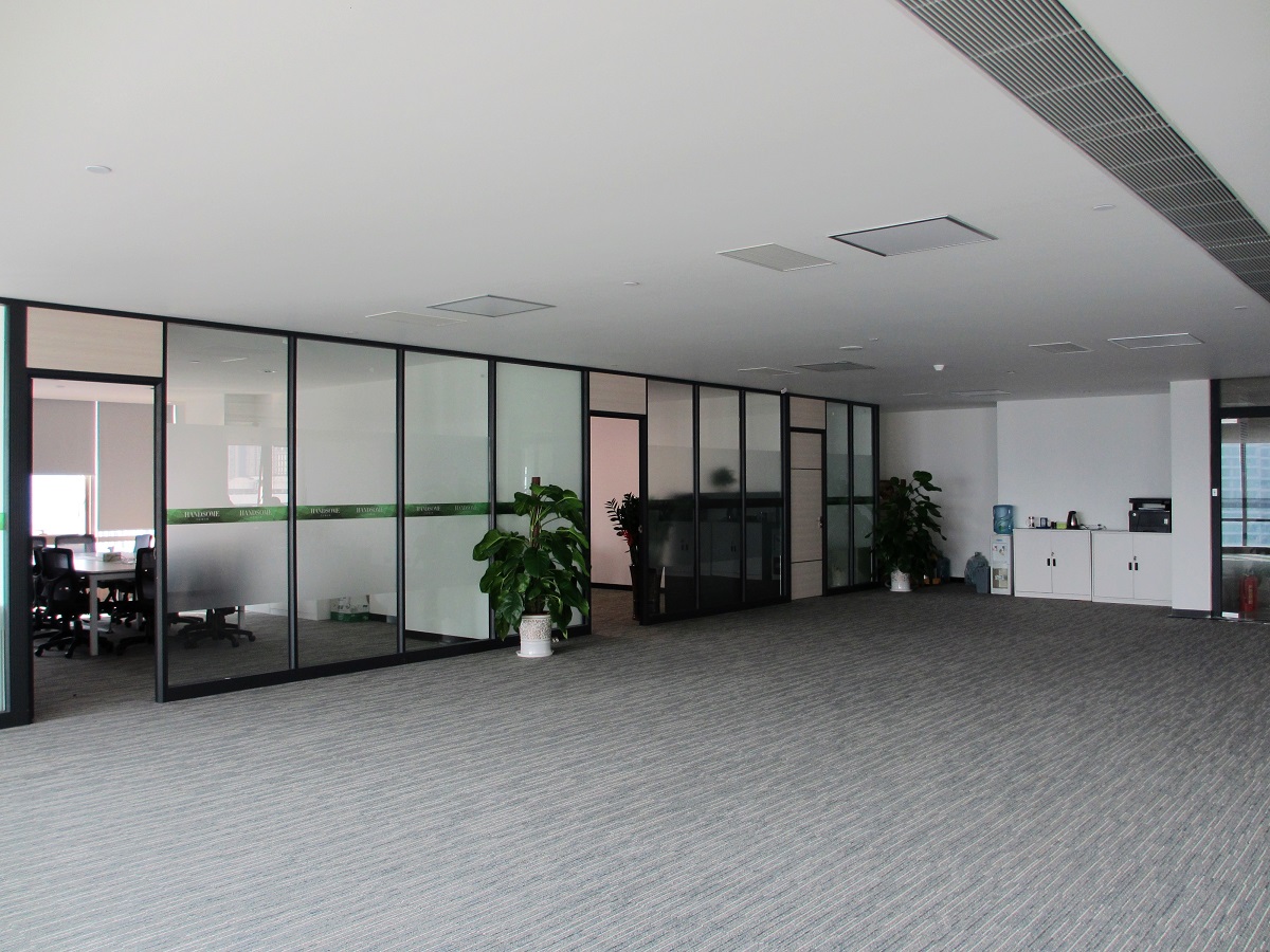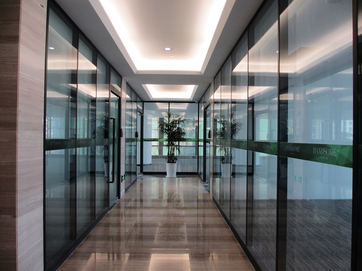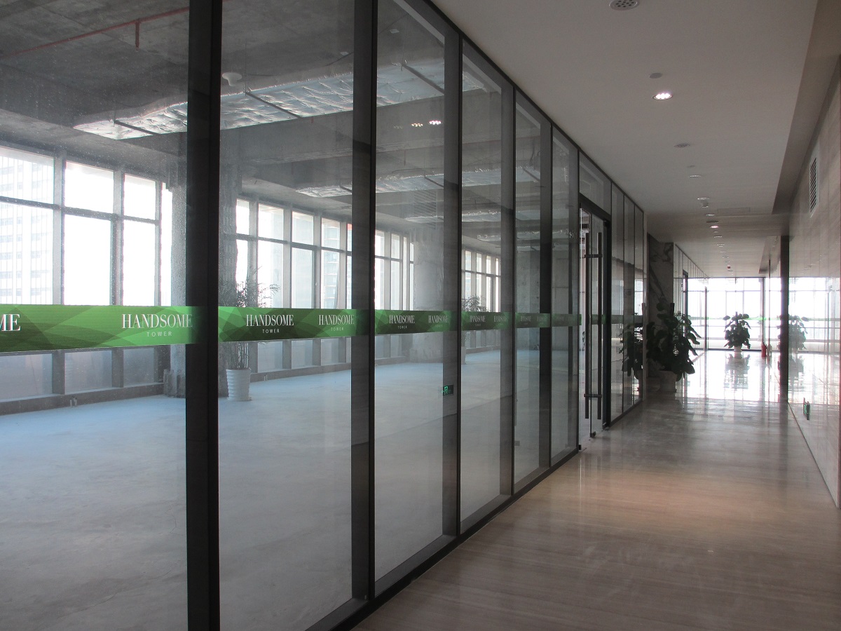 深圳福田瀚森大厦玻璃隔断整栋项目位于坐落在深圳市福田中心区东南片,彩田路与福华三路交汇处,采用雅隔隔墙85款双层玻璃隔断系列,隔墙总厚度85mm,铝合金龙骨平均厚度1.5mm,配置双层5mm钢化玻璃,并且采用地弹簧门,使得整个办公环境通透、雅致、极富现代感.瀚森大厦总楼层34层,一层-6层为商业中心,7层-20层为写字楼,21层-34层为瀚森大酒店,7层-20层走廊位置采用85款玻璃隔断,一层隔断面积为180平方米,总隔断面积2520平方米,施工工期为20天,现已经施工了7层-13层。如需到现场考察可以联系我们。